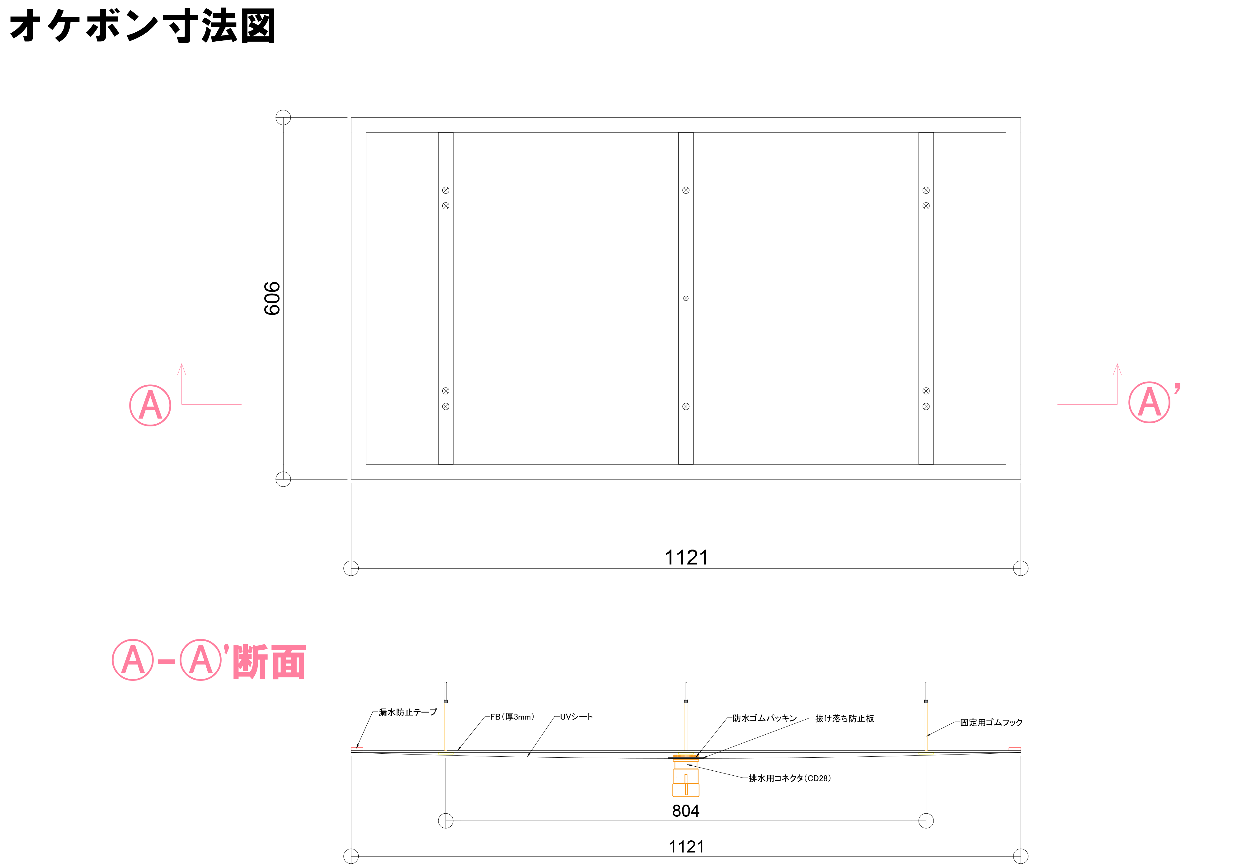オケボン オケボン 寸法図 寸法図 オケボン寸法及び使用上の注意 ※設置の際に転落の危険がある為、細心の注意を払ってください。 ※あくまでも雨水受け用桶ですので、養生蓋としての使用はしないでください。 ※ゴムバンド、結束バンド、カラビナが確実に取り付けられている事を確認してください。 オケボン(セルボン4091型対応)